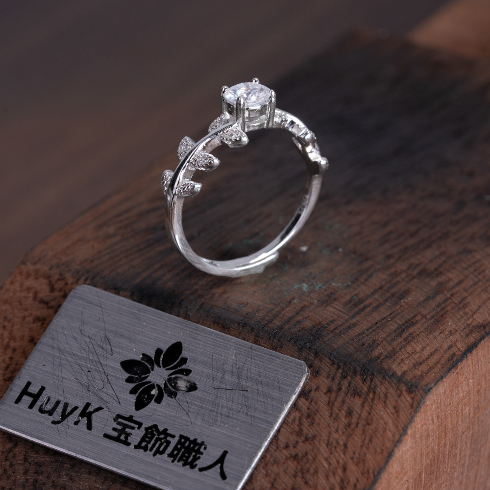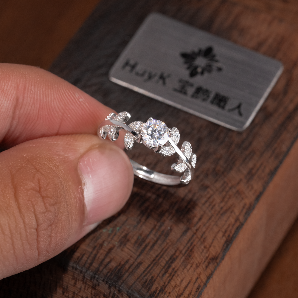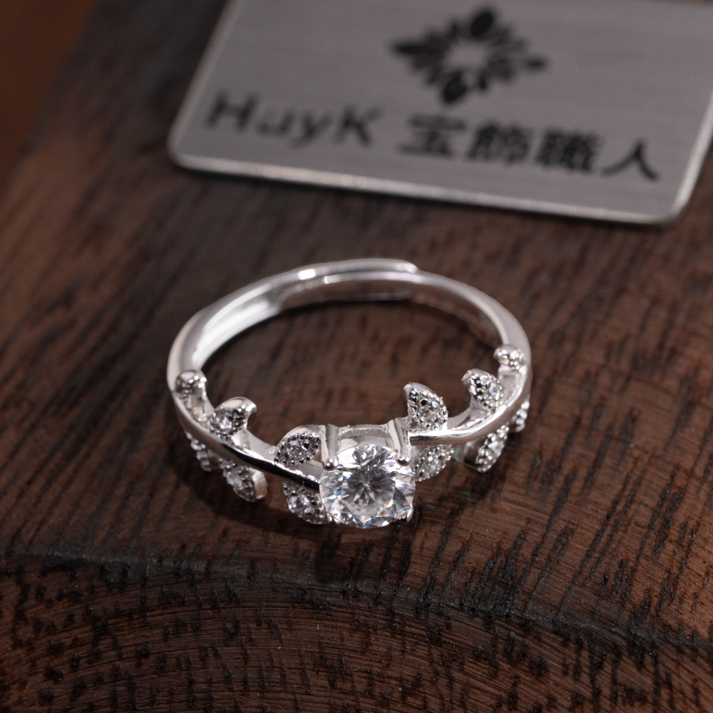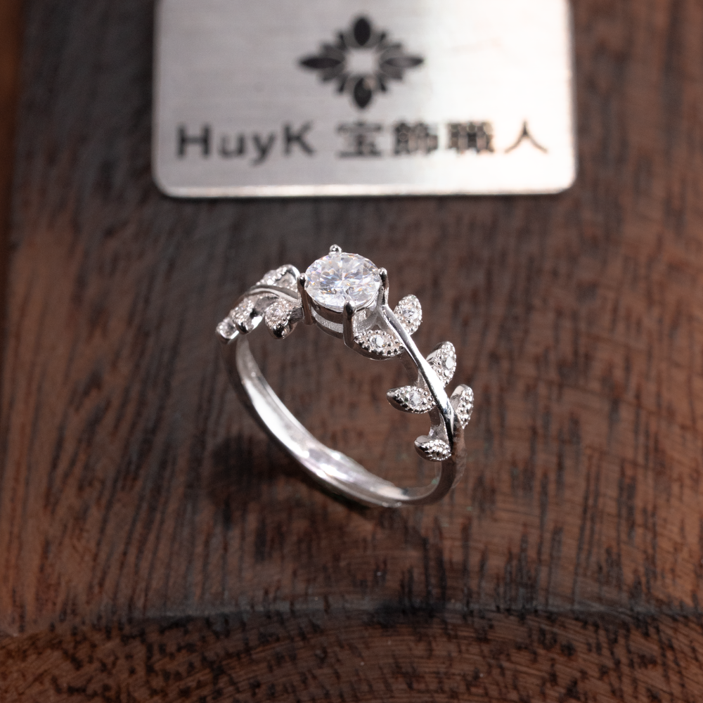 5ミリのモアサナイトが輝く、月桂樹モチーフのレディースリングです。