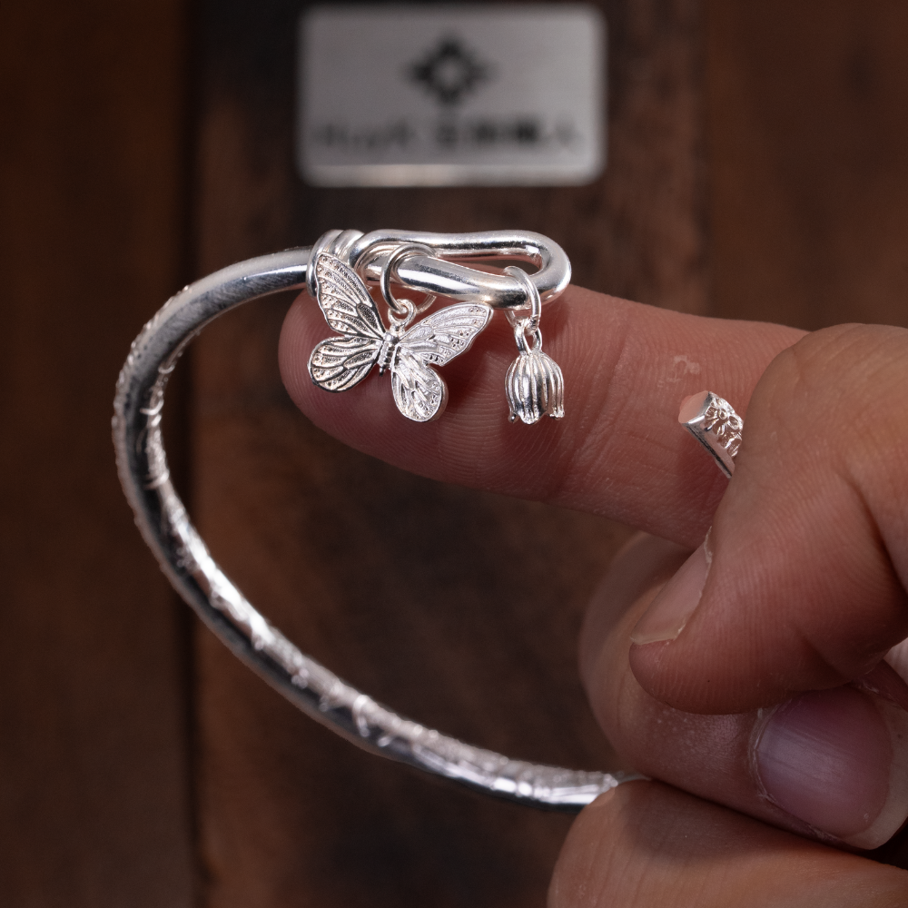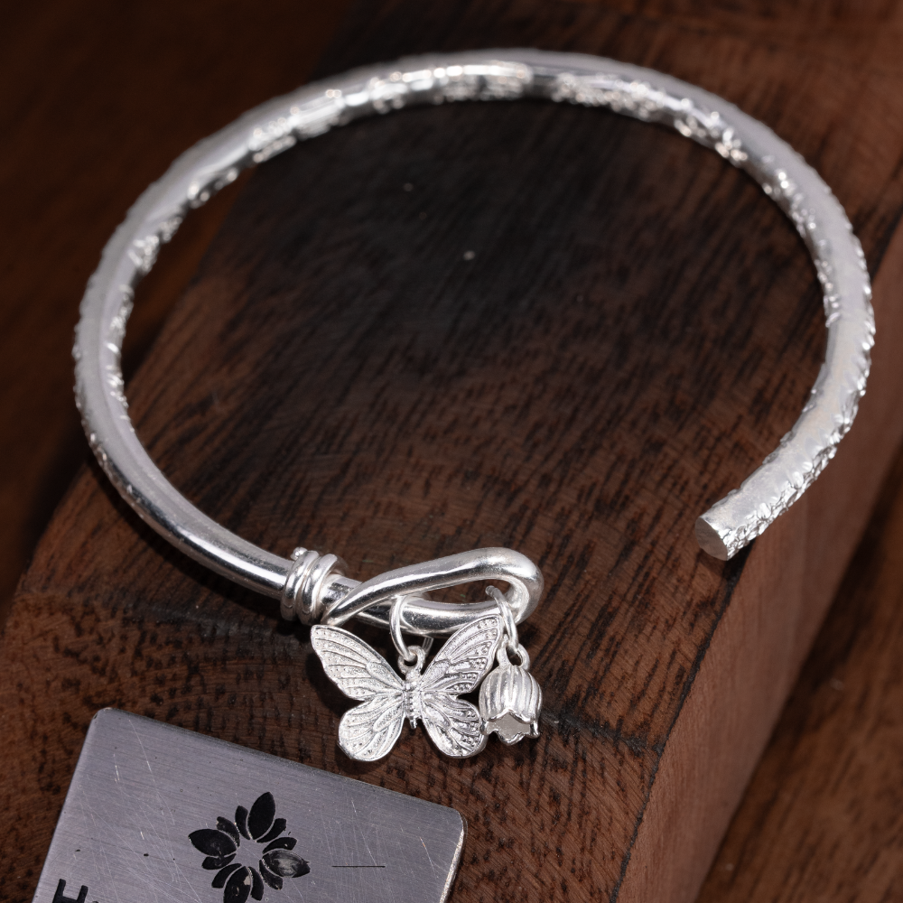 バングルの片側には小さな蝶のチャームが配されており、優雅で軽やかな印象を与えます。もう一方には、緻密にカットされた小さな丸い石があしらわれており、バングル全体をバランスよく引き立てています。このオープンスタイルは、どんな手首にもぴったりとフィットするように簡単にサイズ調整が可能です。